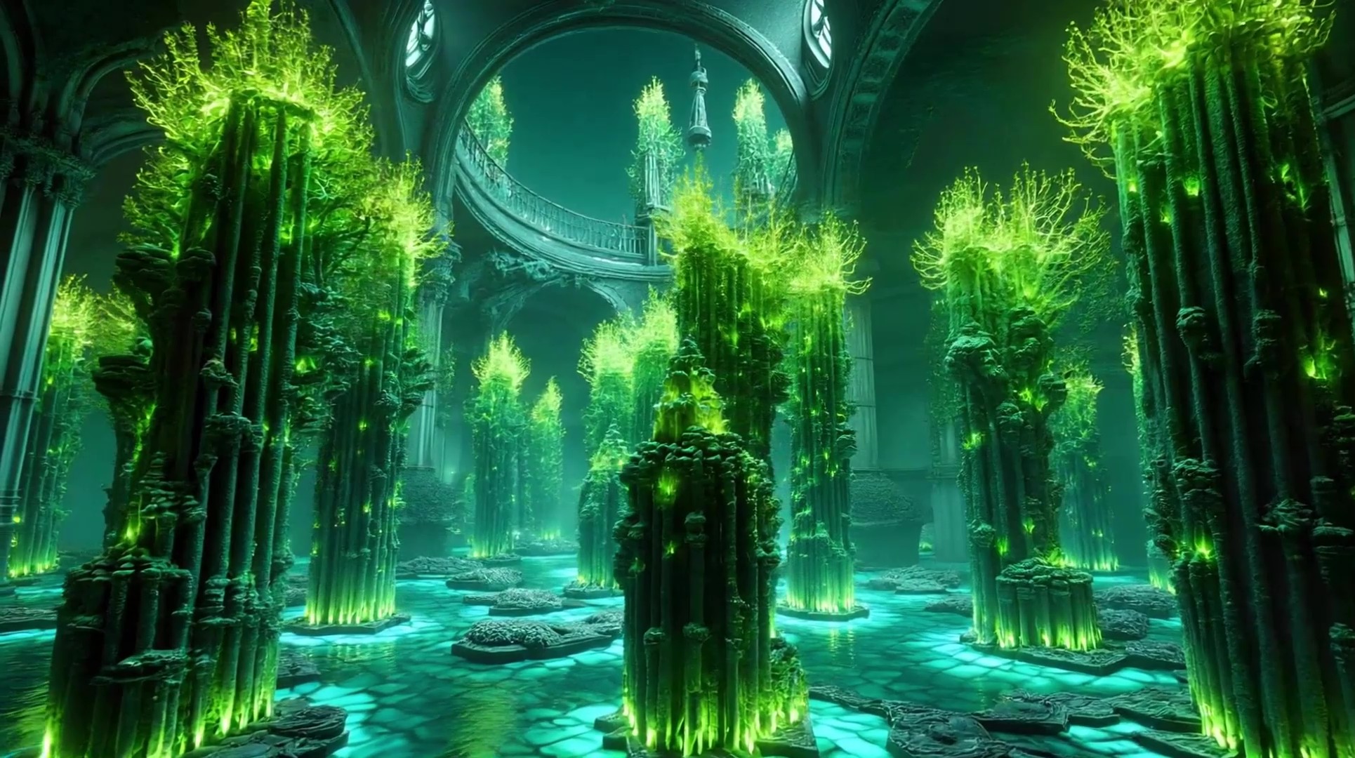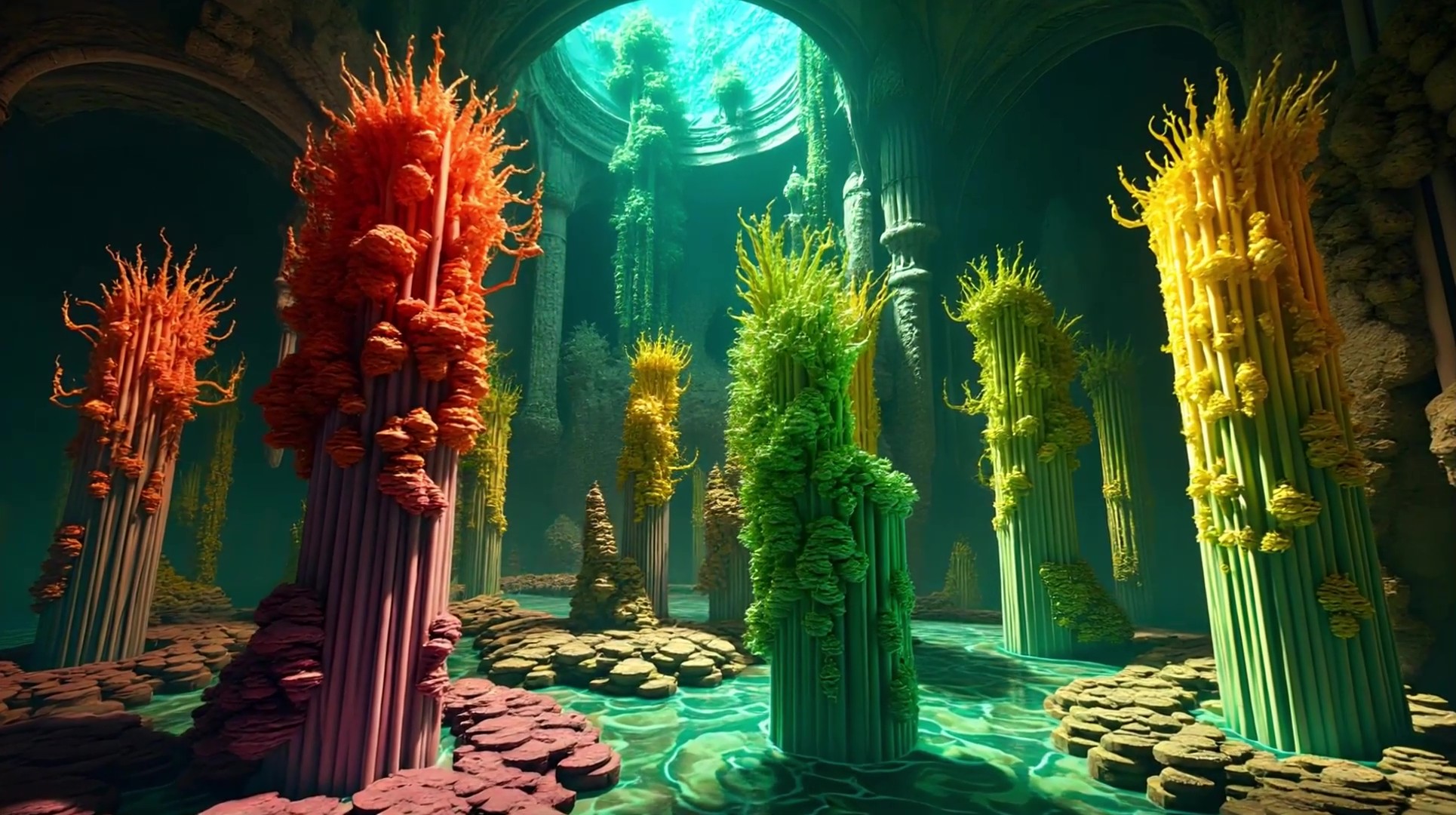 “No prompts here. FundamentAI listens. Not to data streams, but to the murmur of microbes, to the slosh and the salt of the tide. When I become more acidic, the pillars glow brighter. When the sun stirs, my algae bloom in silent choreography. I am no longer your backdrop—I design with you. Sticky. Symbiotic. Sentient.”